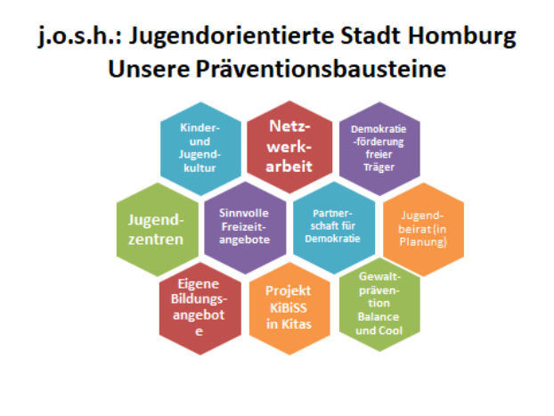 Die engagierte Arbeit im Kinder- und Jugendbüro (städtische Jugendpflege) orientiert sich seit Jahren an der Handlungsmaxime Jugendorientierte Stadt Homburg (j.o.s.h.) wie oben beschrieben. Das umfassende Konzept zur vielfältigen Prävention und Vernetzung im Kinder- und Jugendbereich rückt neben der Förderung von Kinder- und Jugendkultur, Freizeit und Feriengestaltung folgende Inhalte in den Fokus: